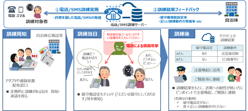 詐欺を模した電話やSMSを訓練参加住民に対して一斉発信し、着信した参加住民が詐欺手口に誘導されてしまうかを確認し、確認結果が後日訓練参加住民やそのご家族にフィードバックされることで、改めて特殊詐欺対策への意識を高めてもらう機会としています。