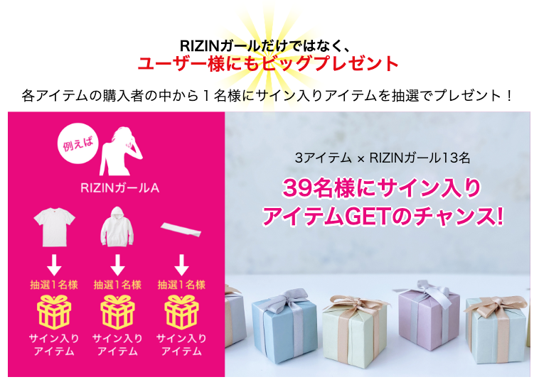 RIZINガール総勢13名によるオリジナルデザイングッズの販売バトルが開催されます。投票の結果、上位入賞を果たしたRIZINガールは渋谷の街頭ヴィジョンに出演します!オリジナルグッズの購入やツイッター投稿など誰でも気軽に投票できるユーザー参加型イベントになっています。あなたの推しのRIZINガールを応援してグランプリに輝かせよう!