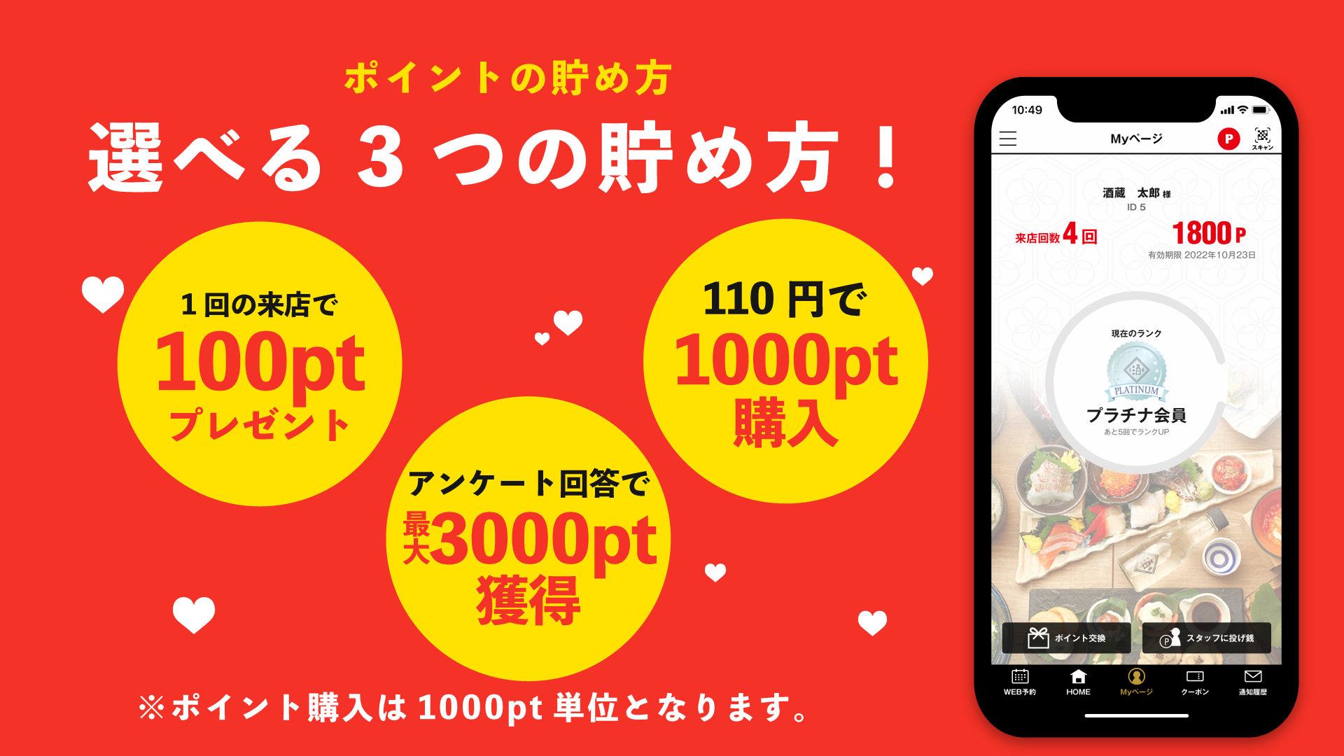 1回来店毎に100pt獲得できます。来店時、スタッフにアプリをご提示で100ptが獲得できます。