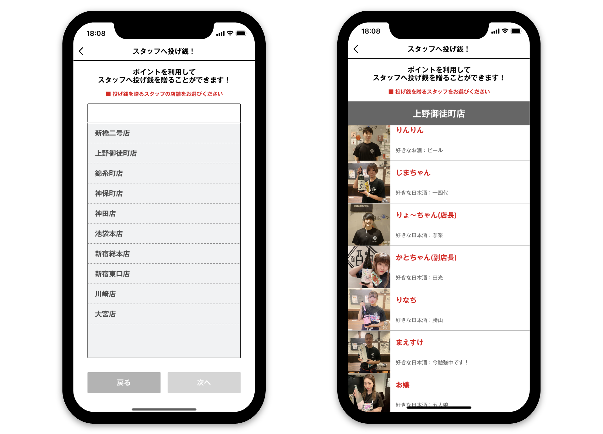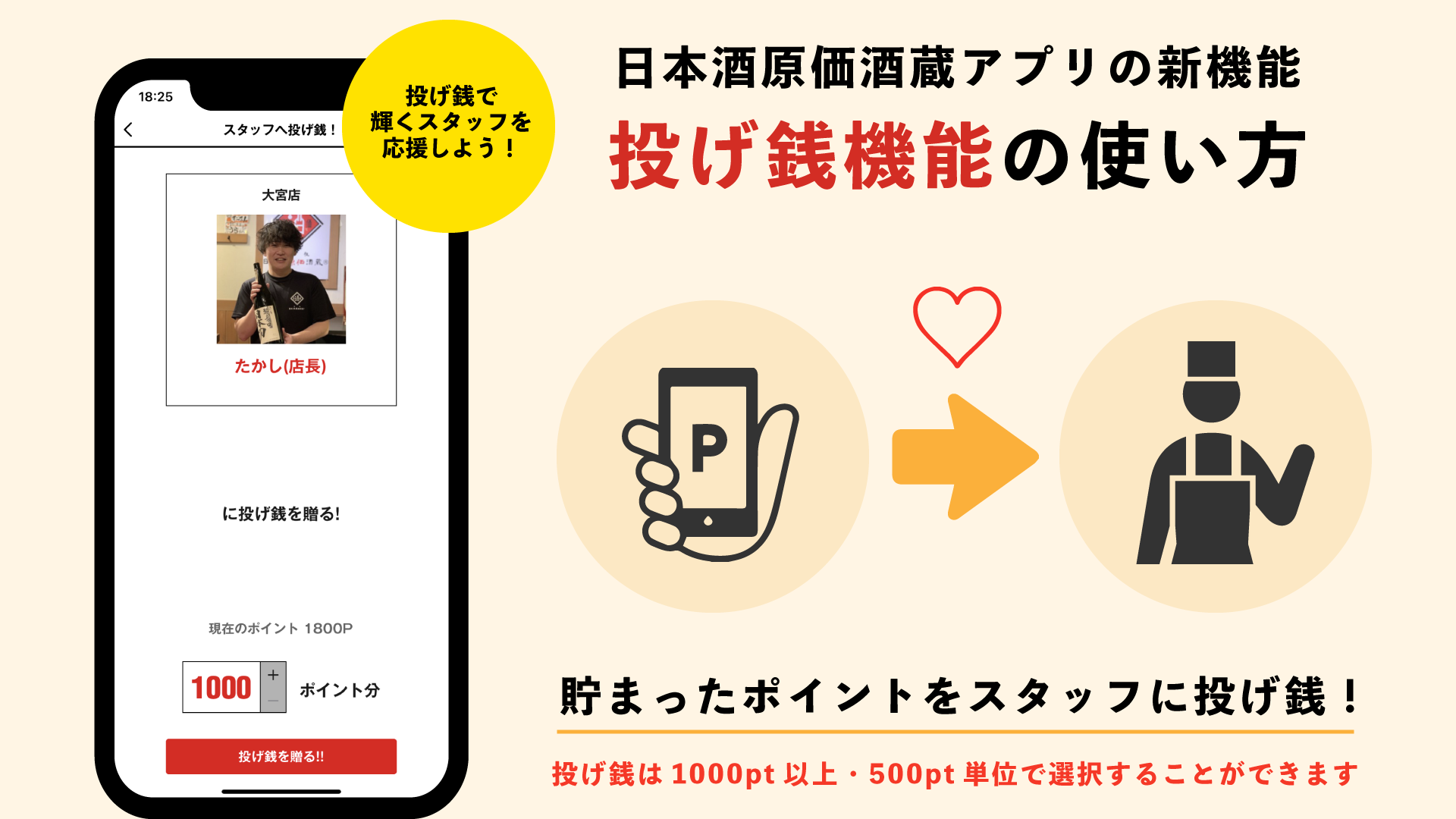 日本酒原価酒蔵公式アプリ、「スタッフに投げ銭」より、店舗選択→スタッフ選択で任意ポイントを1,000ptより付与が可能です。