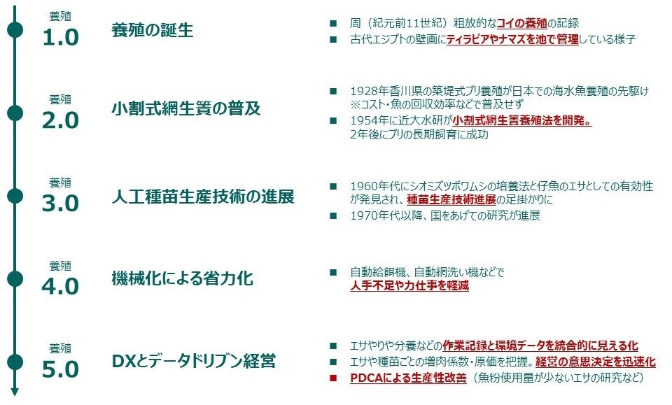 日本の豊かな水産資源と魚食文化を未来に残し続けるために、「おいしい魚が食卓に並ぶ『当たり前』の日々を次の世代につなぐ」というビジョンを掲げています。ミッションは「養殖5.0の社会実装」です。魚類養殖の歴史は紀元前11世紀に遡ります。人類は魚や養殖方法と向き合い、改善を重ねてきました。今後はデータ経営による意思決定の迅速化、生産性改善を図る「養殖5.0」の時代にパラダイムが変わっていくと私達は考えています。