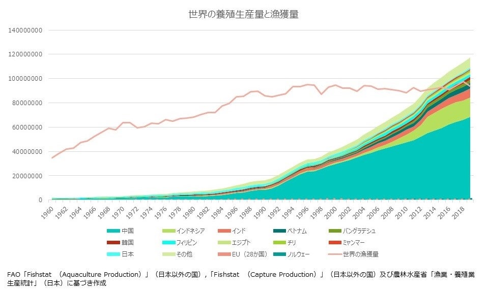 このような中、アジア・オセアニア圏で活発な水産物需要を支えているのが養殖であり、持続可能な水産資源の利活用の観点からも近年注目が集まるようになりました。養殖の生産量が世界で急拡大を続けている一方で、日本においては養殖の生産量がなかなか伸びず、世界のわずか0.8%のみとなっています。