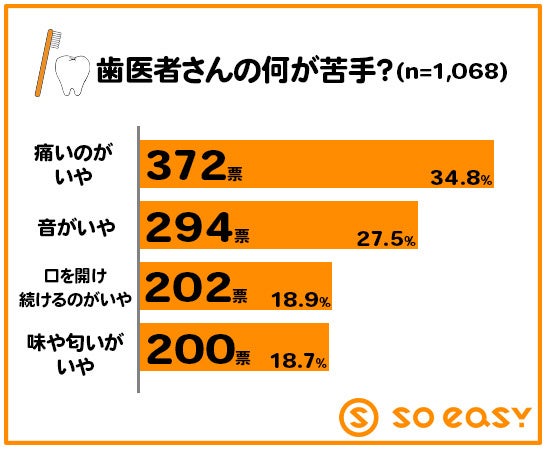 行かない理由で1位となった「苦手」について、少し深掘りして聞いたところ、「痛いのがいや」(372票 34.8%)が1位に。歯科での痛みの経験が苦手意識につながっているようです。「音がいや」(294票 27.5%)も苦手な理由としては多く、痛み、音、に対してのケアが苦手意識を克服する視点になりそうです。