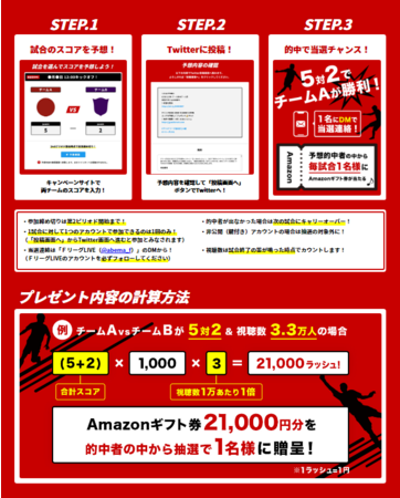 今シーズンは、ABEMAの新企画が登場!キャンペーンサイト「ゴールdeラッシュ」からスコアを予想すると、予想が的中した方のなかから抽選でAmazonギフト券をプレゼント。インターネットテレビ局「ABEMA」の「SPORTSチャンネル」にて生中継いたしますので、ぜひご視聴ください。