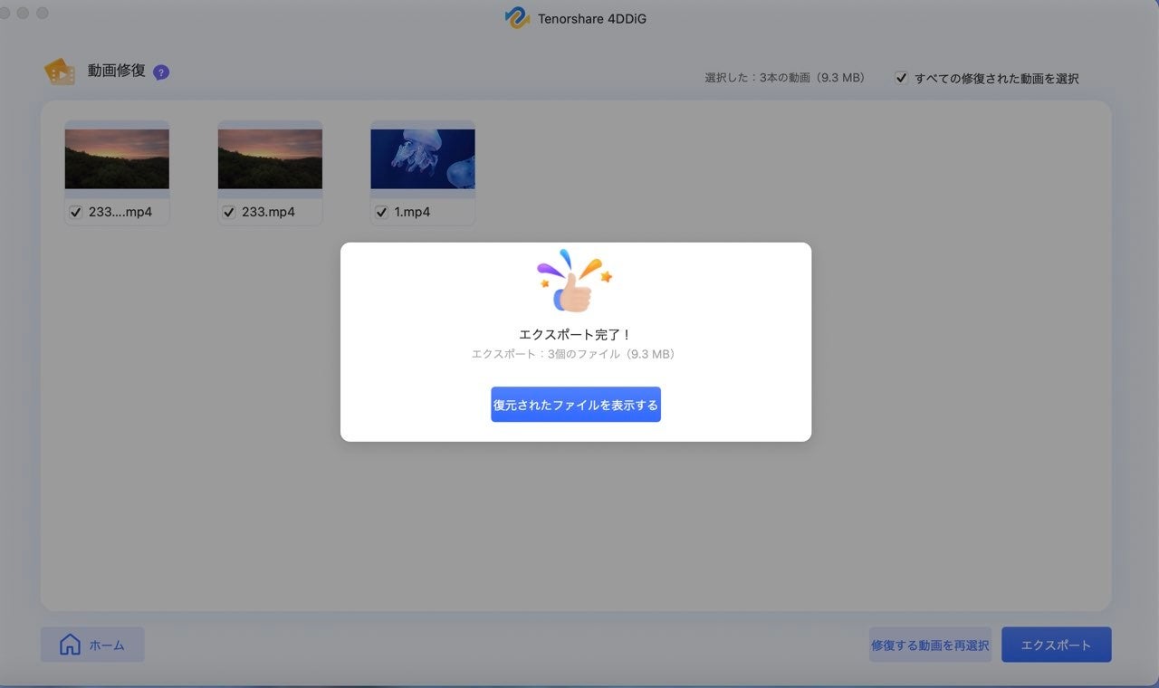 いかがでしょうか?たった3ステップMacで破損した動画を修復できます。写真修復の操作も同じです。詳細は4DDiG Macのガイドページをご覧ください。