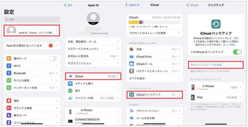 Apple IDの変更作業の過程で、何らかの不具合や操作ミスによってデータを失ってしまうことがないよう、事前にバックアップを取っておきましょう。また、iCloudでバックアップを取っている場合には、Apple IDの変更後にも再度バックアップを作成しておくと良いでしょう。