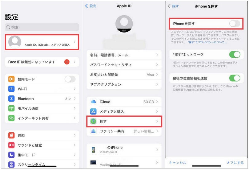 また、「iPhoneを探す」がオンの状態のままだと、利用できない各種サービス・機能があります。