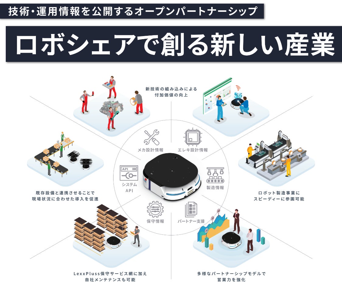LexxPlussでは自社の自動搬送ロボットを始めとするやロボティクス技術をパートナー向けに公開をすることで、産業の自動化・持続可能化を加速させるオープンパートナーシップを促進しています。自社設備で導入したい、自社製品と組み合わせて新しいソリューションを想像したい、ロボット関連の新規事業を立ち上げたい、など共に新産業の想像を目指すパートナーを募集しています。