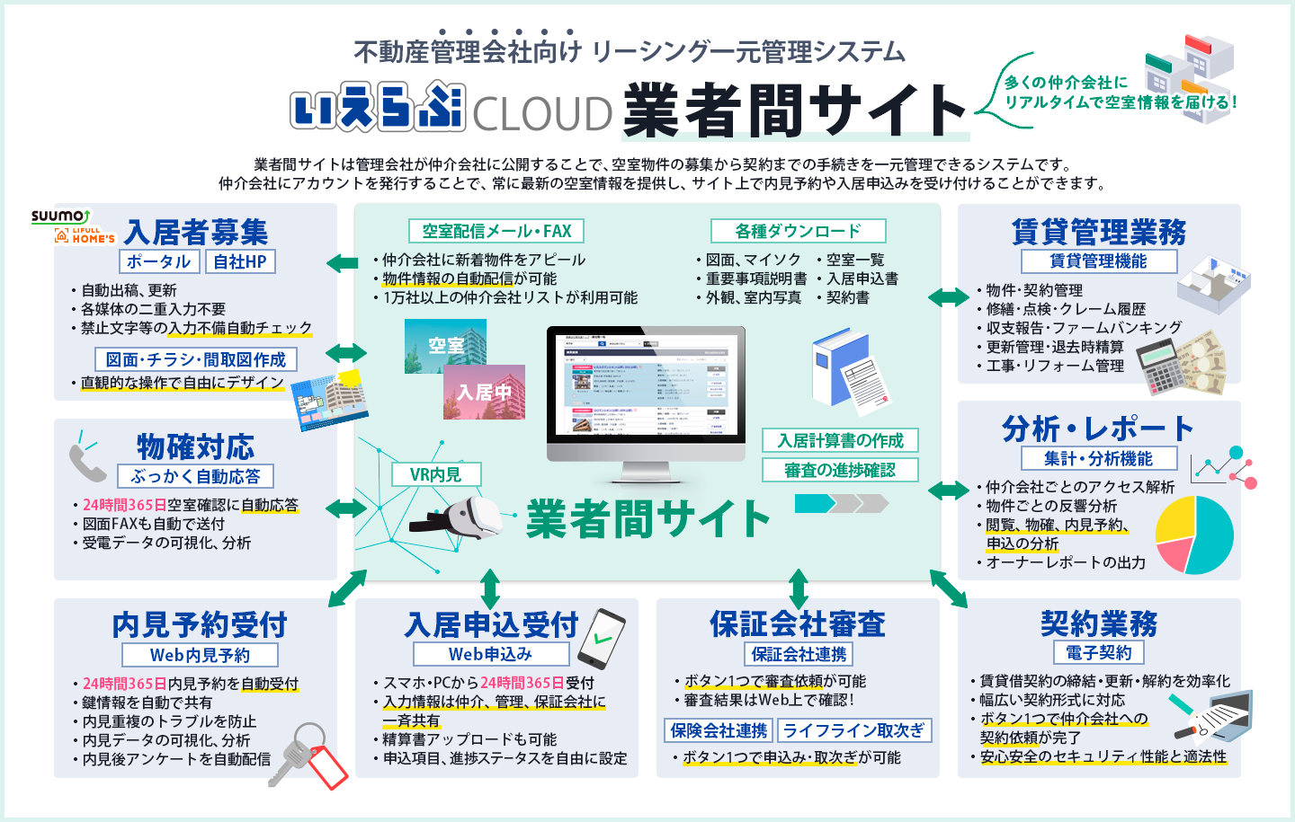 賃貸管理会社が各社専用で仲介会社に公開できる空室情報共有サイトです。仲介会社による物確(物件確認)、内見予約、入居申込みを「業者間サイト」で受け付け、Web上で手続きを完結させることができます。空室情報はリアルタイムで更新され、仲介会社は24時間365日いつでも空室情報を確認することができます。