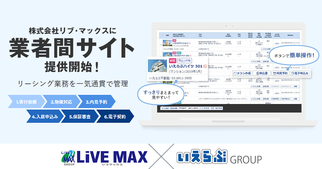 リブ・マックスは「業者間サイト」を導入することにより、入居手続きのすべてをオンラインで完結できるようになり、さらなる業務効率化と自社ブランド力の向上が可能となりました。