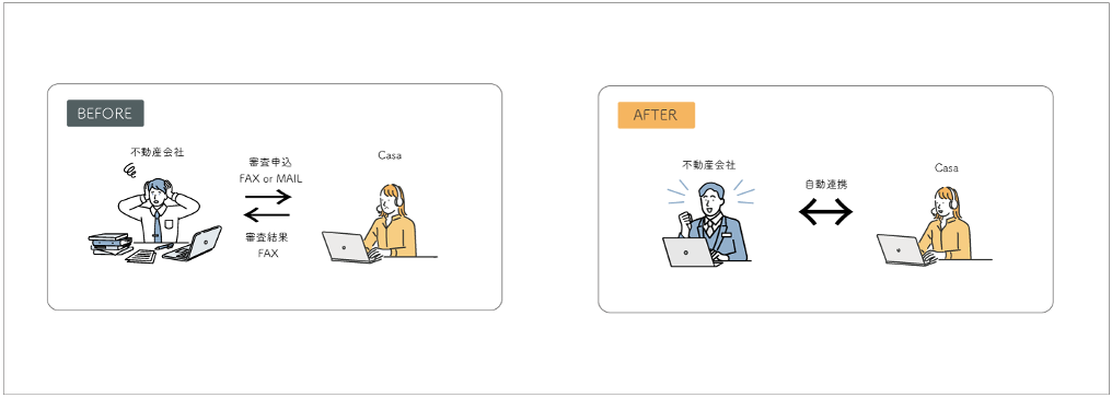 本システム連携により、不動産会社は保証審査をWEBシステム上で申込を行い、審査結果の確認もできるため、業務手間が大幅に改善されます。当社においても、自社システムへの保証申込情報の連携により、入力業務や不鮮明な書類などの確認作業が軽減できるため、審査時間の短縮や業務効率化が可能です。