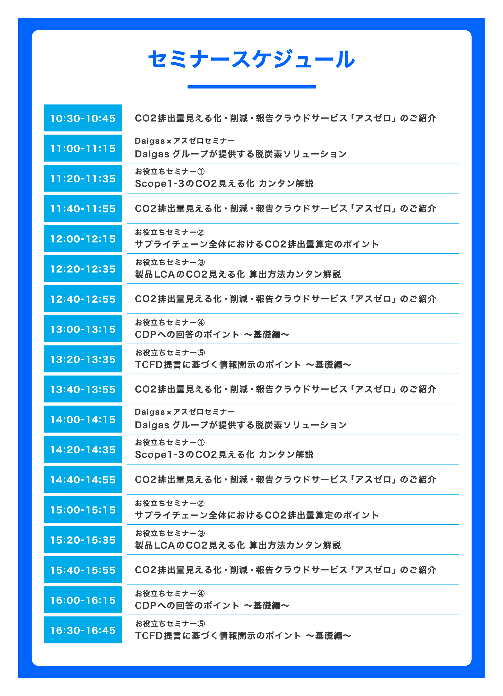 本展示会のブースではミニセミナーを行います。製品LCA算定やCDP・TCFDの報告方法を説明するお役立ちセミナーをはじめ、Daigasグループとのコラボセミナー、「アスゼロ」についてなど、脱炭素経営のヒントとなりうる情報をご紹介します。