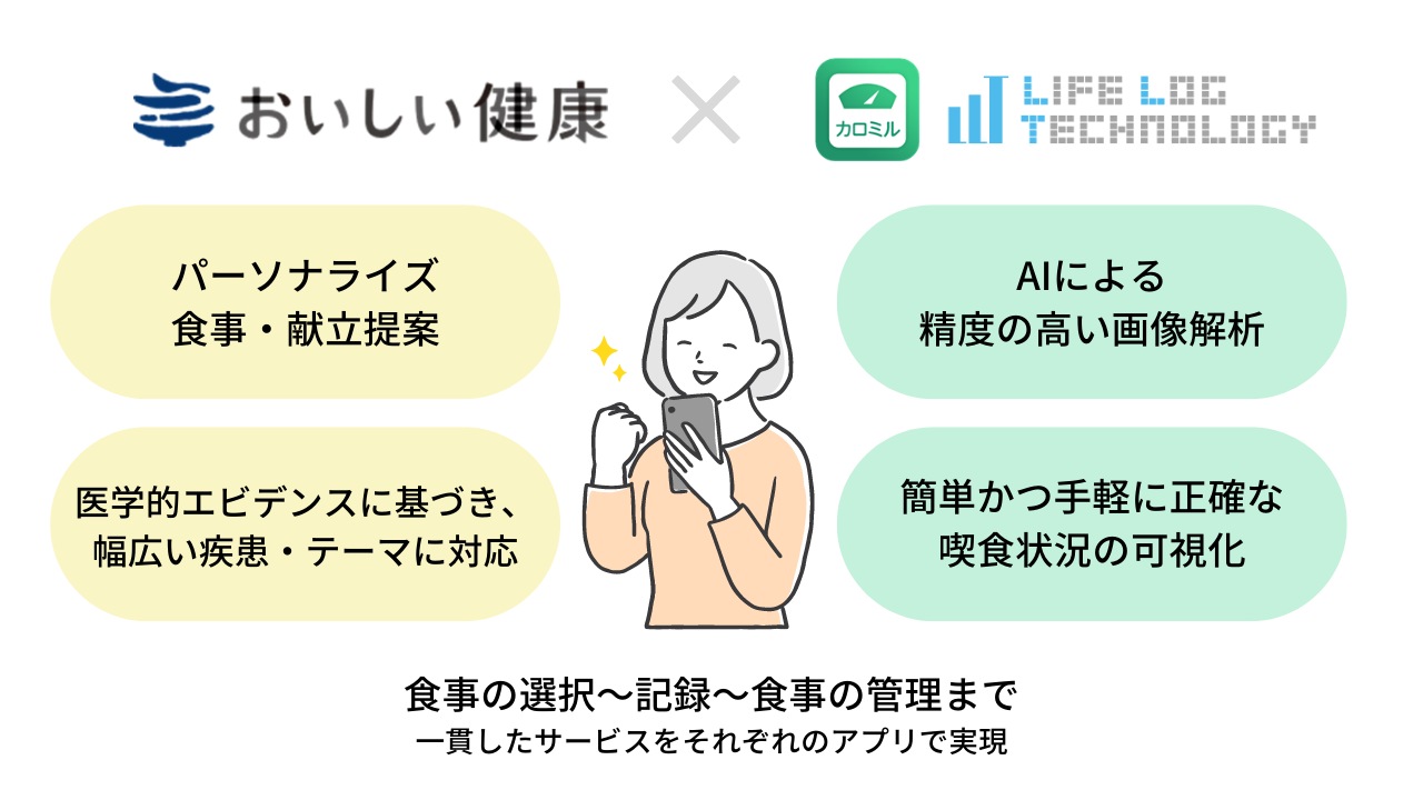 今回、食事記録に強みを持つ当社と、一人ひとりの健康状態に適したパーソナル食事提案に強みを持つ「おいしい健康」は、食事の選択~記録~食事の管理まで一貫したサービスを、互いの強みをかけ合わせながらそれぞれのアプリで実現すべく、業務提携契約を締結することといたしました。