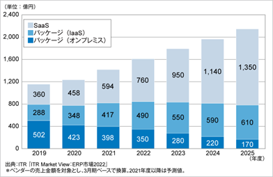 出典:ITRプレスリリース「2020年度のERP市場はコロナ禍の影響で前年度比6.9%増とやや低調、2021年度はリニューアル案件、新規案件ともに増加傾向にあり2桁成長を予測ITRがERP市場の提供形態と運用形態別の市場規模推移および予測を発表」2022年3月24日