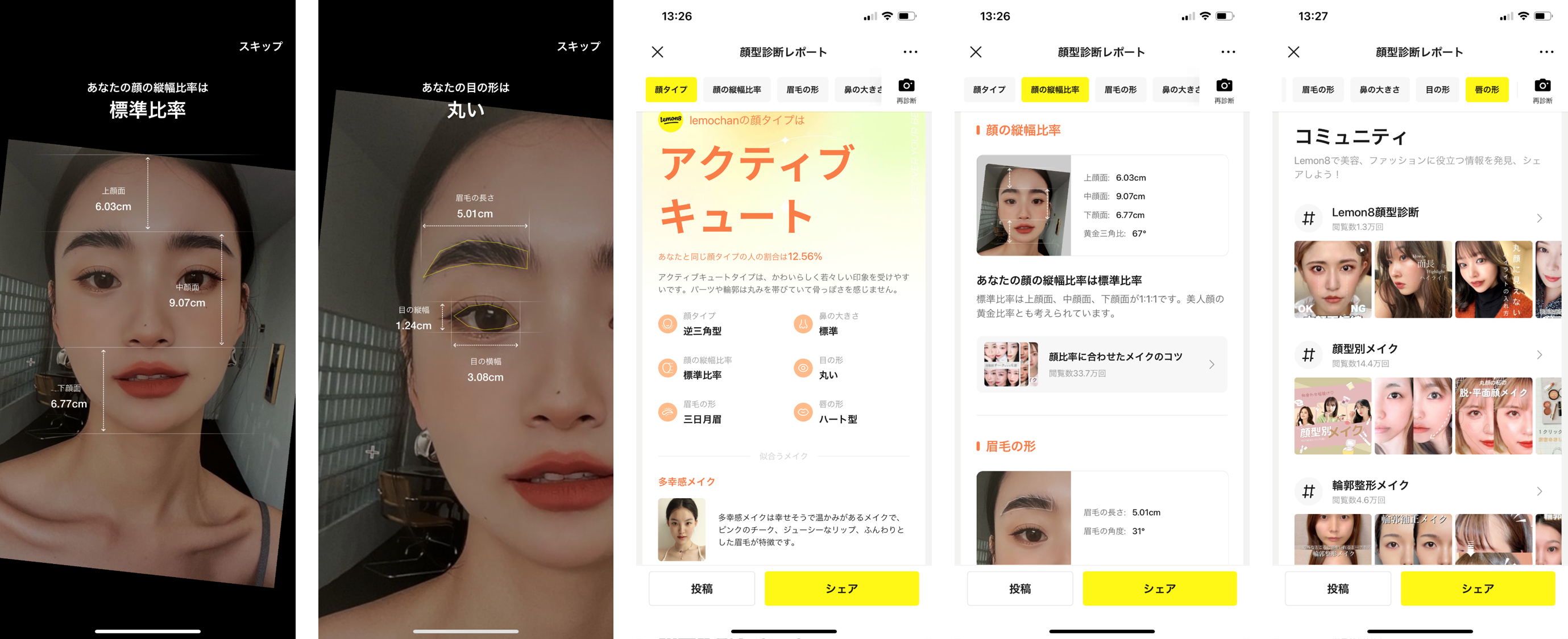 「Lemon8 顔型診断」とは、スマホで写真を撮るだけで、顔・目・眉の形、顔の比率、鼻の大きさ、唇の形などの総合的な顔型診断レポートを作成できる機能です。友人や有名人と自分の顔タイプを比較することができます。また、診断レポートに基づいて似合うメイクのコツの投稿をおすすめします。