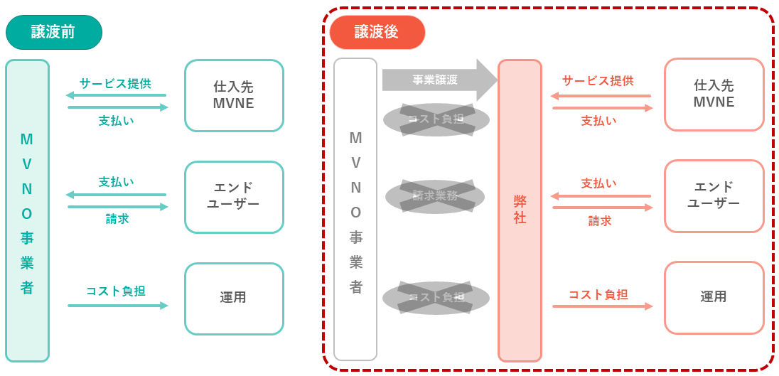 本サービスによる事業譲渡では既存のサービス内容を変更することなくそのまま当社が事業を譲り受けることから、当社が仕入先であるMVNE等への支払いやエンドユーザーへの請求・サポートを一貫して行うほか、カスタマーサポートなど運用・保守面についても対応するため、既存ユーザーが引き続きサービスを同一内容同一品質にて利用し続けることができます。MVNO事業を譲渡する事業者は、これまで毎月発生していたカスタマーサポート・請求・支払といった運用コストを削減することが可能です。また、エンドユーザーからこの事業譲渡によるクレームや風評被害が発生する可能性を可能な限り抑えた形で安心して事業を譲渡することができます。
