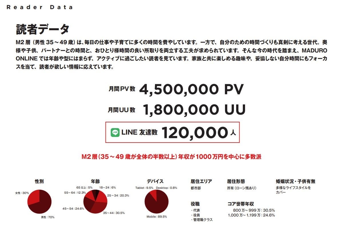 「MADURO ONLINE」はM2 層(男性 35~49 歳)をターゲットとし、アクティブな遊びと暮らしの視点から、ファッション、スポーツ、クルマ・バイク、キャンプ、リゾートなど、家族・友人との過ごし方や、自ら熱中できる趣味をテーマにした情報をカバーしています。