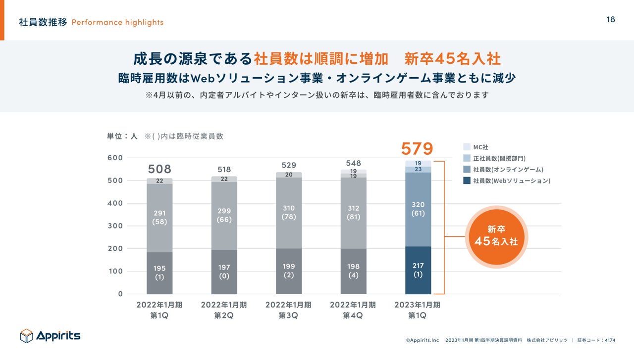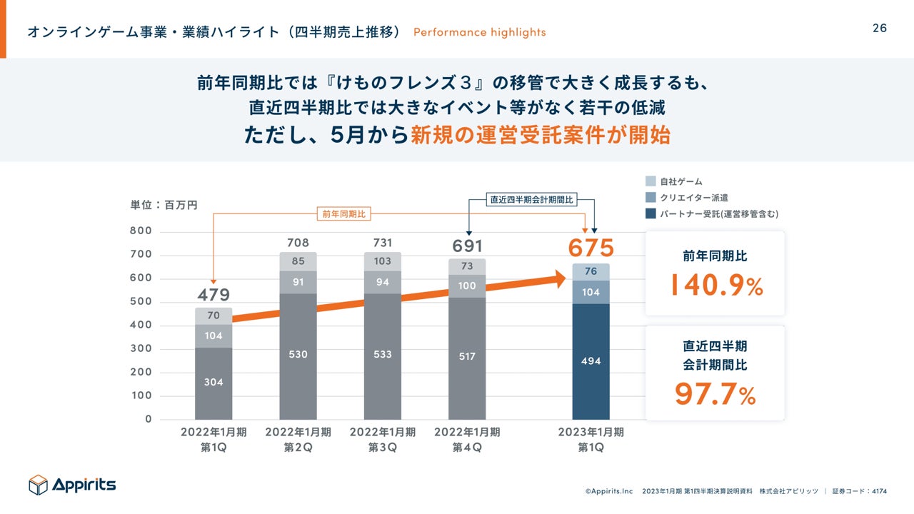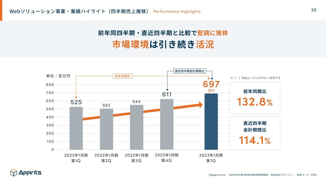 株式会社アピリッツ(本社:東京都渋谷区、代表取締役社長執行役員CEO:和田 順児)は、2022年6月14日開催の取締役会において、2023年1月期第1四半期決算を確定いたしましたのでお知らせいたします。Webソリューション事業においては、前年同四半期・直近四半期と比較で堅調に推移し、市場環境は引き続き活況です。また、オンラインゲーム事業においては、5月より新規の大型運営受託案件を開始いたしました。全社として増収増益を目指します。