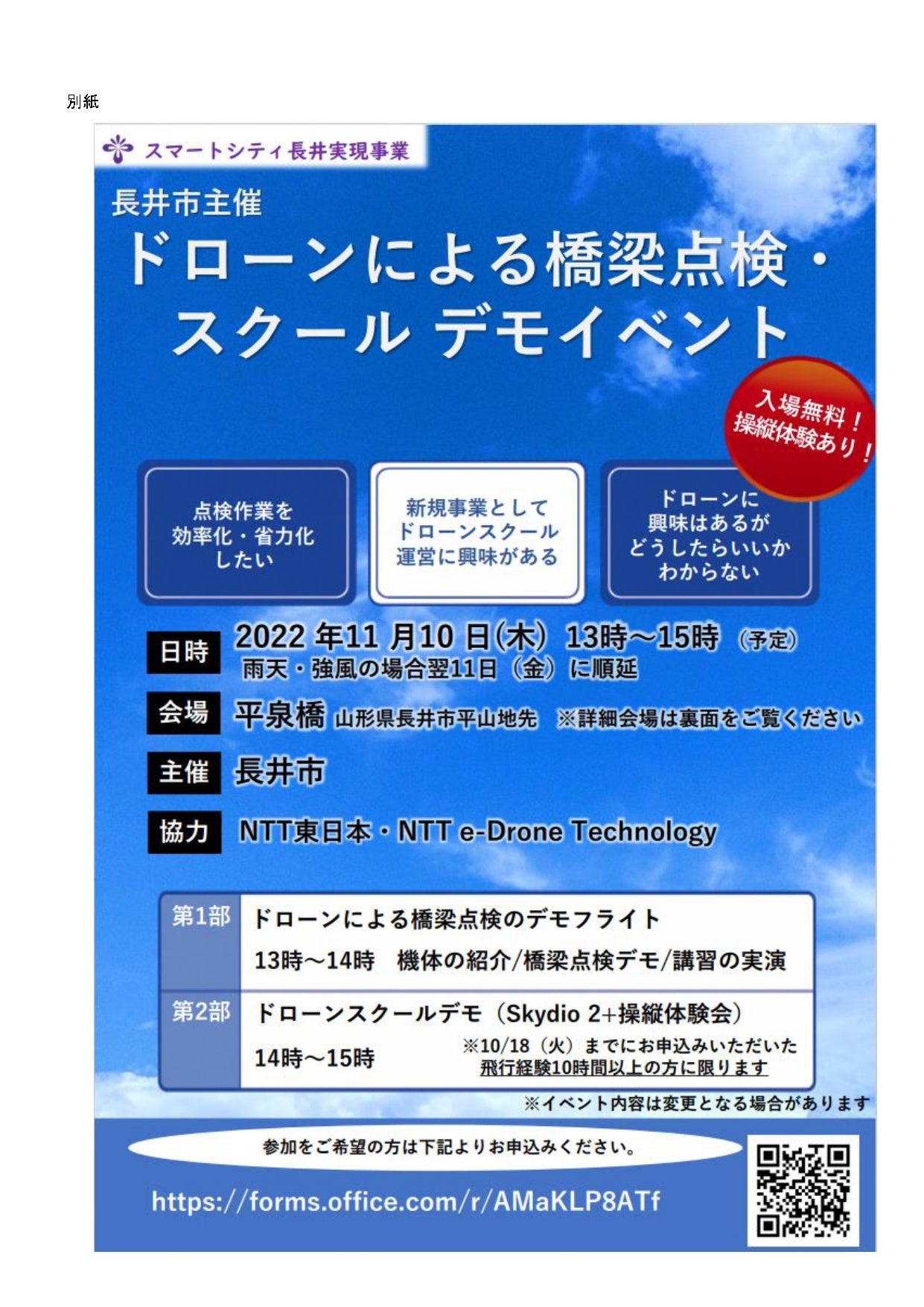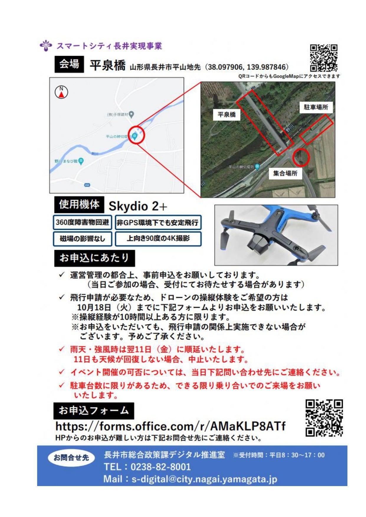 今回、株式会社NTT e-Drone Technology(以下、NTTイードローン)の協力を得て、インフラ点検で利用が拡大しているドローン「Skydio2+※1」を使用し、長井市内の実際の橋梁を用いた点検デモフライト並びにドローン実機の操縦体験※2を通したドローンスクールデモを実施します。