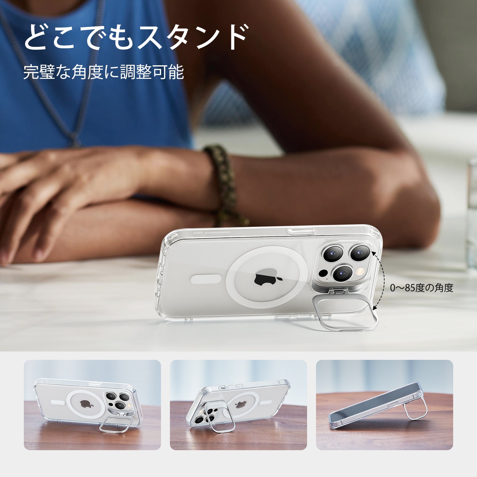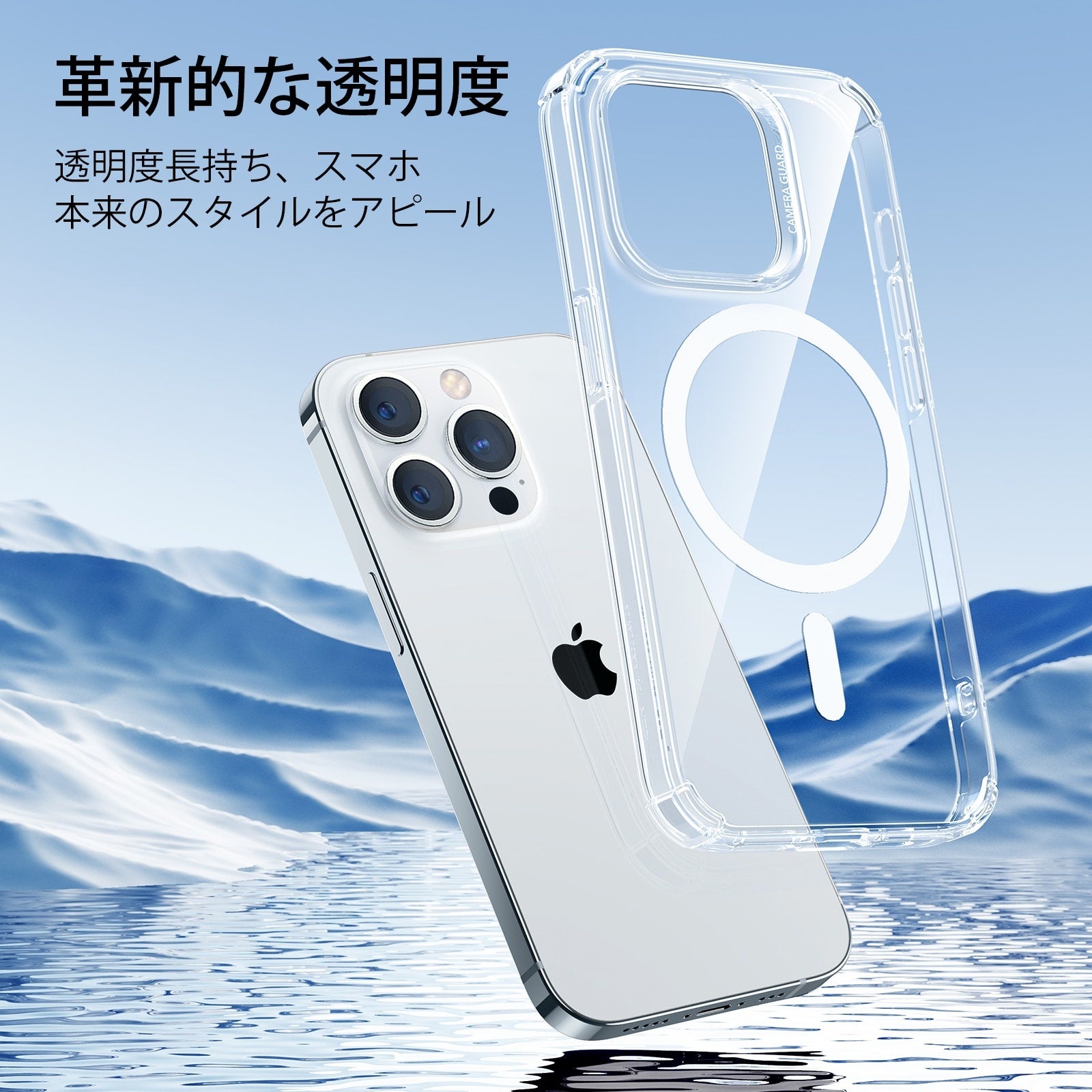 黄変しない超透明なポリカーボネート素材を使用した超クリアケース。吸着力1,500 gを備えた強力な内蔵磁石により、HaloLockやMagSafeアクセサリーにしっかり吸着し、衝撃吸収コーナー、スクリーンエッジ、カメラガードは、あらゆる場面でスマートフォンを保護。