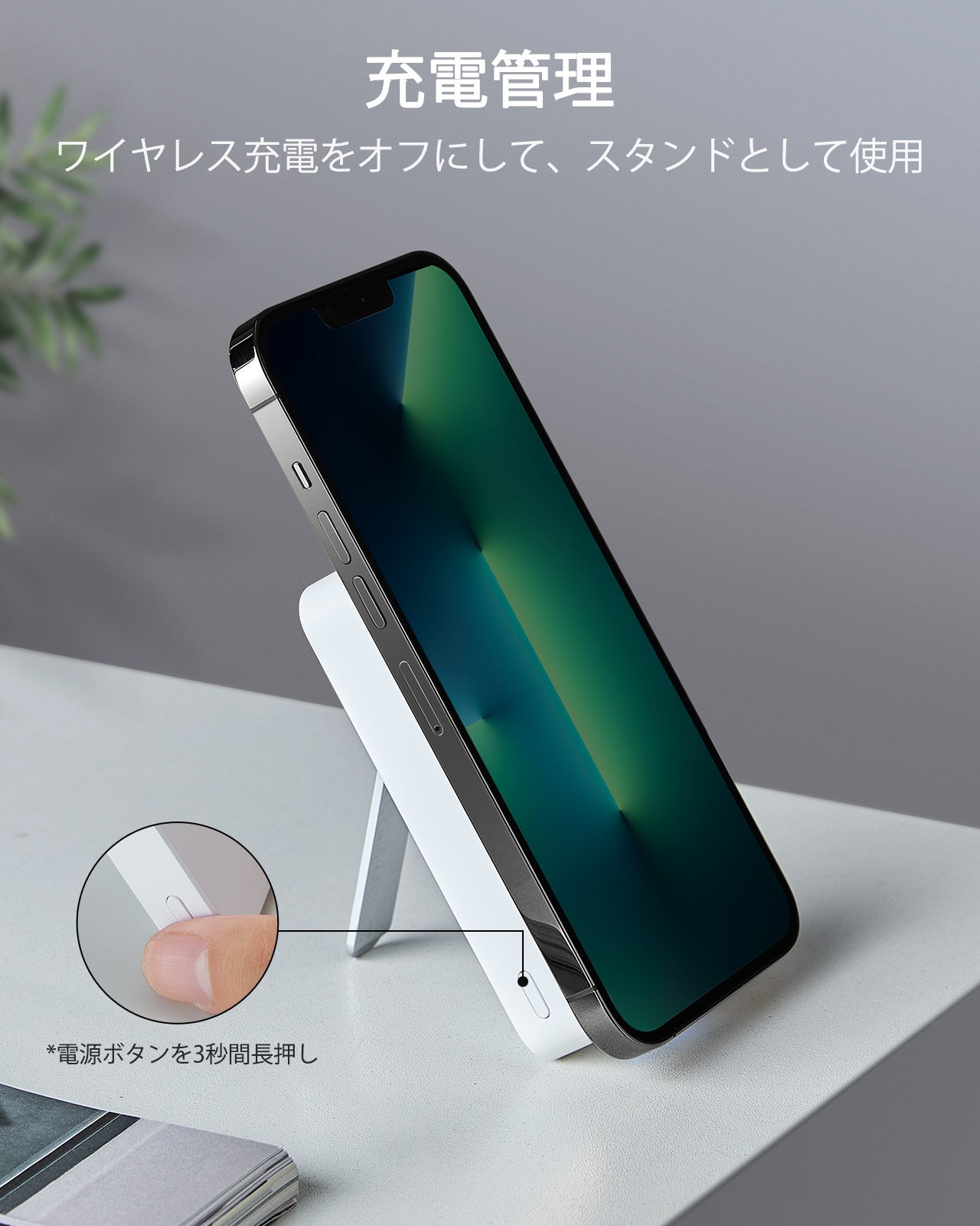 横向き縦向きのどちらでも使用できるキックスタンドを搭載したワイヤレスモバイルバッテリー。磁石によりワンタッチで充電を開始し、1,000gの吸着力で充電中のiPhoneをしっかり固定します。バッテリー容量は、5000mAhと10000mAhの2種類を用意し、ケーブルによるバッテリー充電時には、iPhoneとバッテリーの両方を同時に充電することができます。