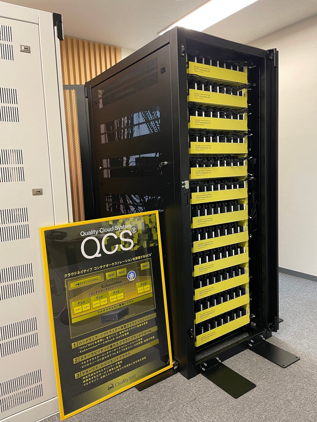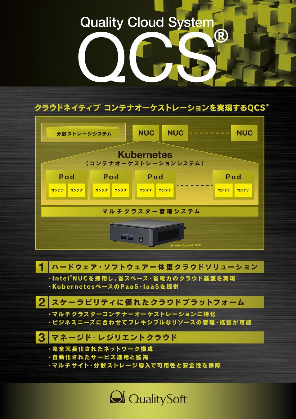 クオリティソフトからは、自社で構築運用するクラウドネイティブな「Quality Cloud System」(※1)の出展を行います。インテル® NUC(※2)を多数使ったマルチクラスター構成のKubernetes(※3)のデモンストレーションを実施いたします。