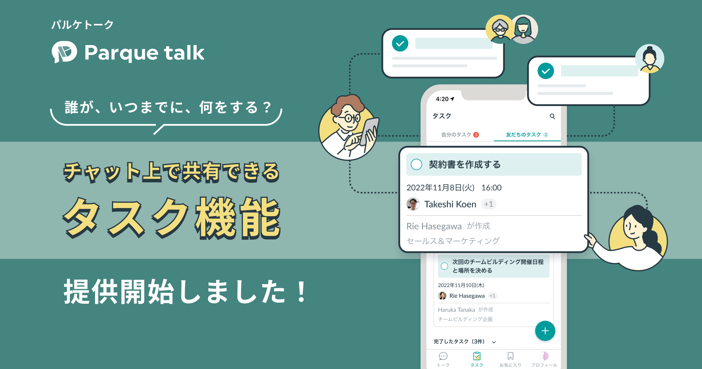今回、新しく追加されたタスク機能は、パルケトークの参加メンバーへ「担当者・期限・内容」をまとめたタスクを容易に共有することや、一覧にして進捗の確認ができるなど、効率的なタスク管理をおこなえるようになります。