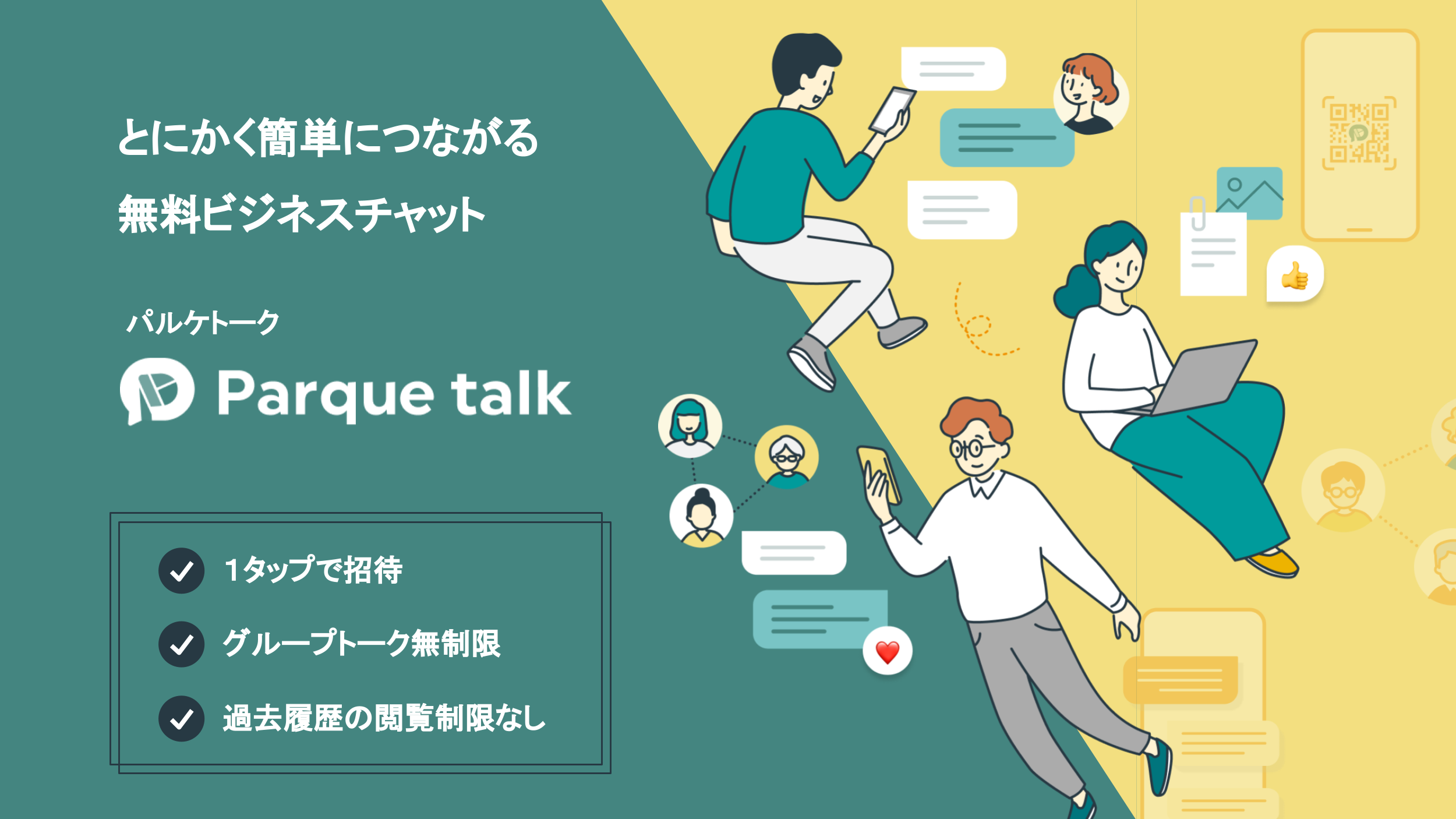 パルケトークは「とにかく簡単につながるビジネスチャット」をコンセプトにしたメッセージアプリです。コストや機能制限を気にせずビジネスチャットを利用したい企業や、シンプルで誰もが使いやすい操作性を求める企業におすすめです。また、完全無料のアプリなため、会社を超えたプロジェクトや社内コミュニケーションに加えて、NPO・PTA・マンション管理組合など地域のコミュニティ活動、ゼミやサークル活動などさまざまなシーンで気軽にご利用いただけます。