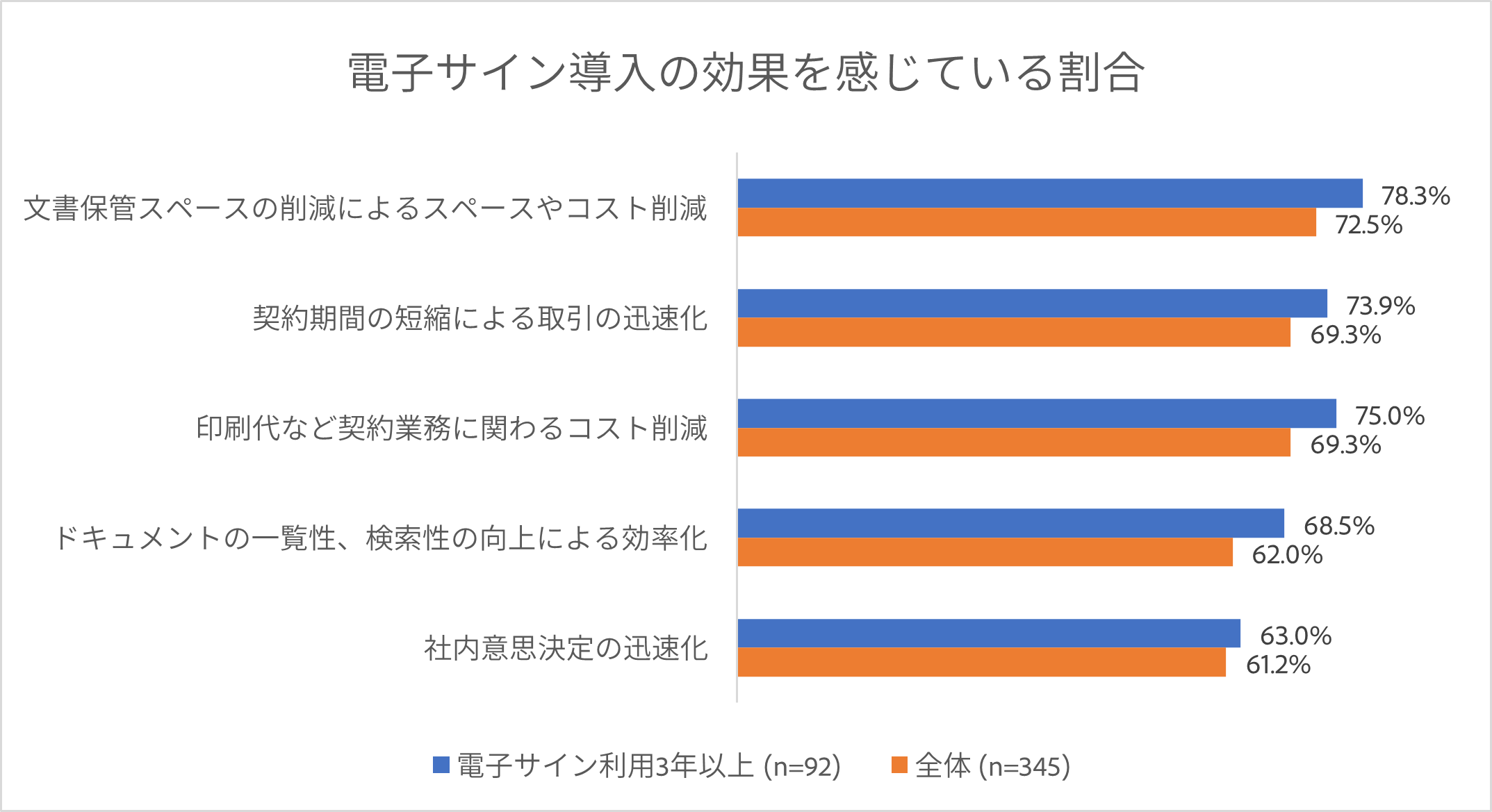 企業が電子サインの導入効果を感じている上位5つの要素として、「文書保管スペースの削減によるスペースやコスト削減」、「契約期間の短縮による取引の迅速化」、「印刷代など契約業務に関わるコスト削減」、「ドキュメントの一覧性、検索性の向上による効率化」、そして「社内意思決定の迅速化」を挙げています。これらの要素において、電子サインを導入して3年以上経過している企業の方が、調査対象全体と比べて導入効果を感じている割合が高いことがわかりました。特に、上位4つの理由では約5%前後の差があり、電子サインの活用度合いに応じて導入効果が実感されている点が見受けられます。