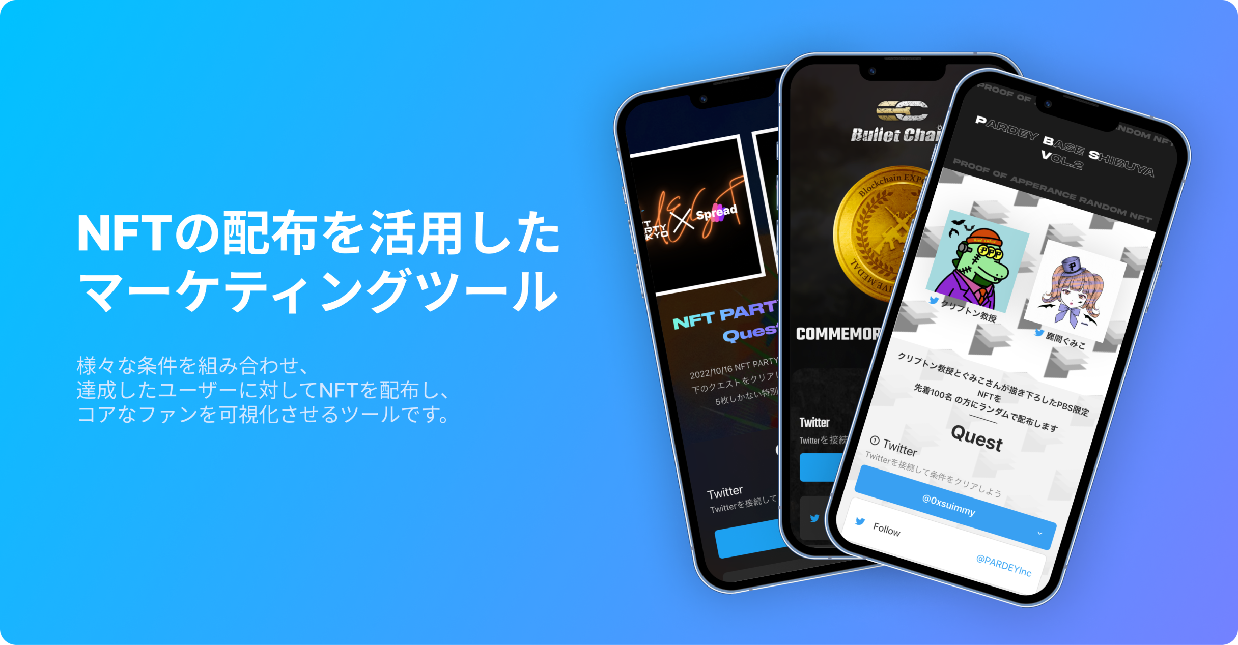 「Spread」はTwitterのFollow、Retweet、Likeなどの条件を設定し、達成者へNFTを配布できるツールです。NFTの配布に多くの手間がかかるという課題から、工数簡略化ツールとしてスタートし、多くのクリエイター様にご活用いただいております。
