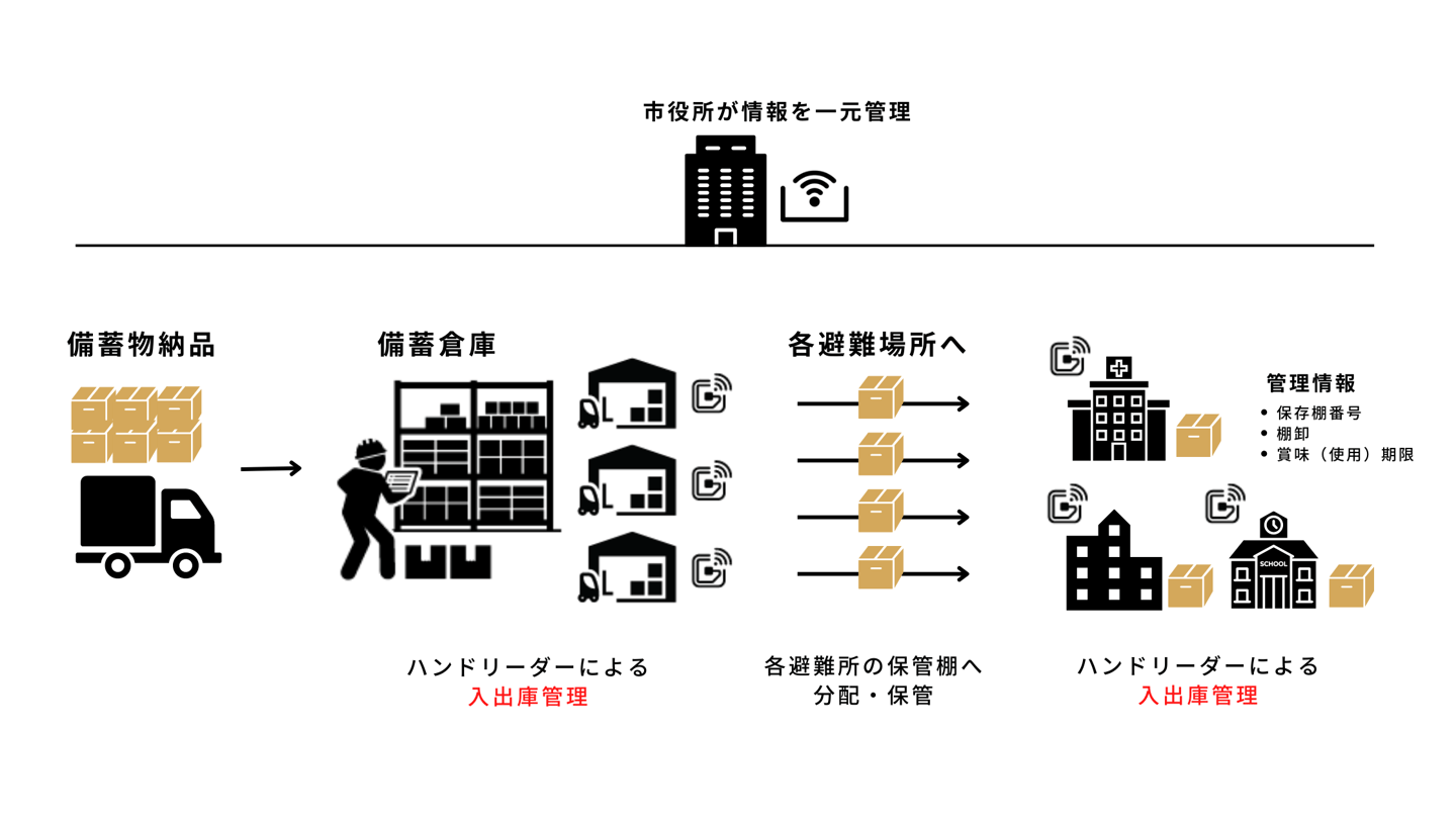 当システムは、災害用備蓄物資の入出庫確認や賞味期限等の管理業務を、RFID活用によって効率化します。これにより、災害時に備蓄倉庫から各避難所等に分配される物資の状況がリアルタイムで可視化され、迅速かつ効率的な備蓄物資の提供を可能にする環境整備を実現。災害時の安全・安心に寄与することを目的としております。