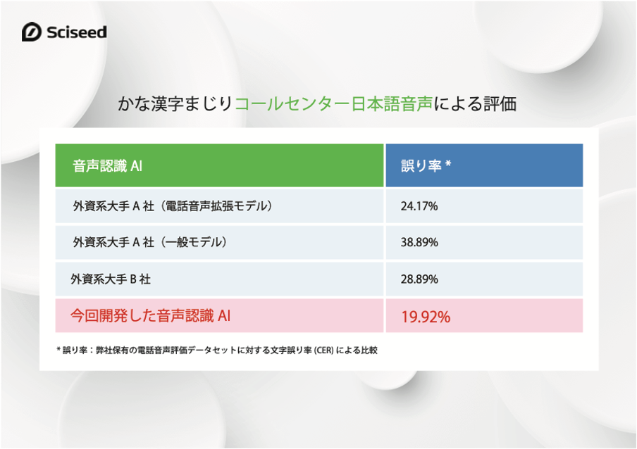 また、雑音が多く一般に音声認識が困難とされている「電話音声」に特化したAIの独自開発も行い、こちらも他社製のAIを大きく凌ぐ性能を示しています。