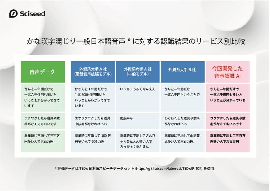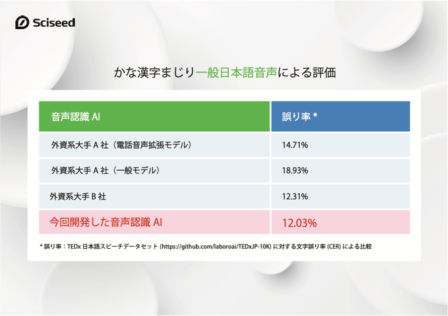 本共同開発では、サイシードが培ってきた音声認識の知見、JDSCが持つアカデミックな知見、アルゴリズム開発のノウハウを合わせることで、上記性能を達成しました。
