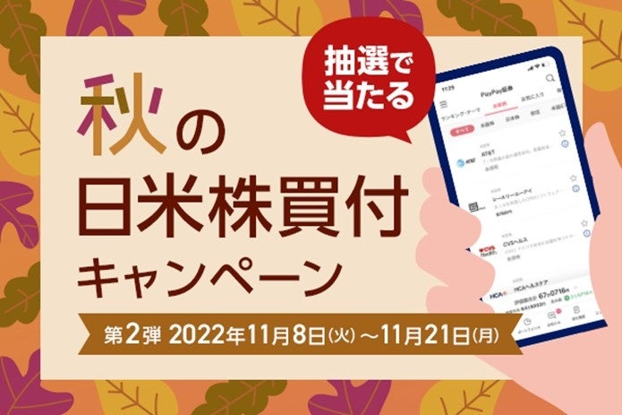 PayPay証券では、好評いただいておりました「秋の日米株買付キャンペーン 第1弾」に続き2022年11月8日(火)から第2弾を実施します。詳細は、キャンペーン概要をご確認ください。