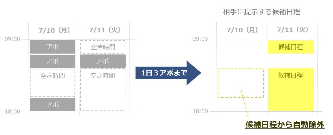 Googleカレンダー・Outlook予定表に代表されるカレンダーツール上の「空き時間」を自動で判断しながら日程調整できるツールにおいて、主に以下方式によって、ある特定の会議(※1)の数が「単位期間」あたりの「上限数」を超過しないように自動で制限しながら、会議の日程調整ができる技術。