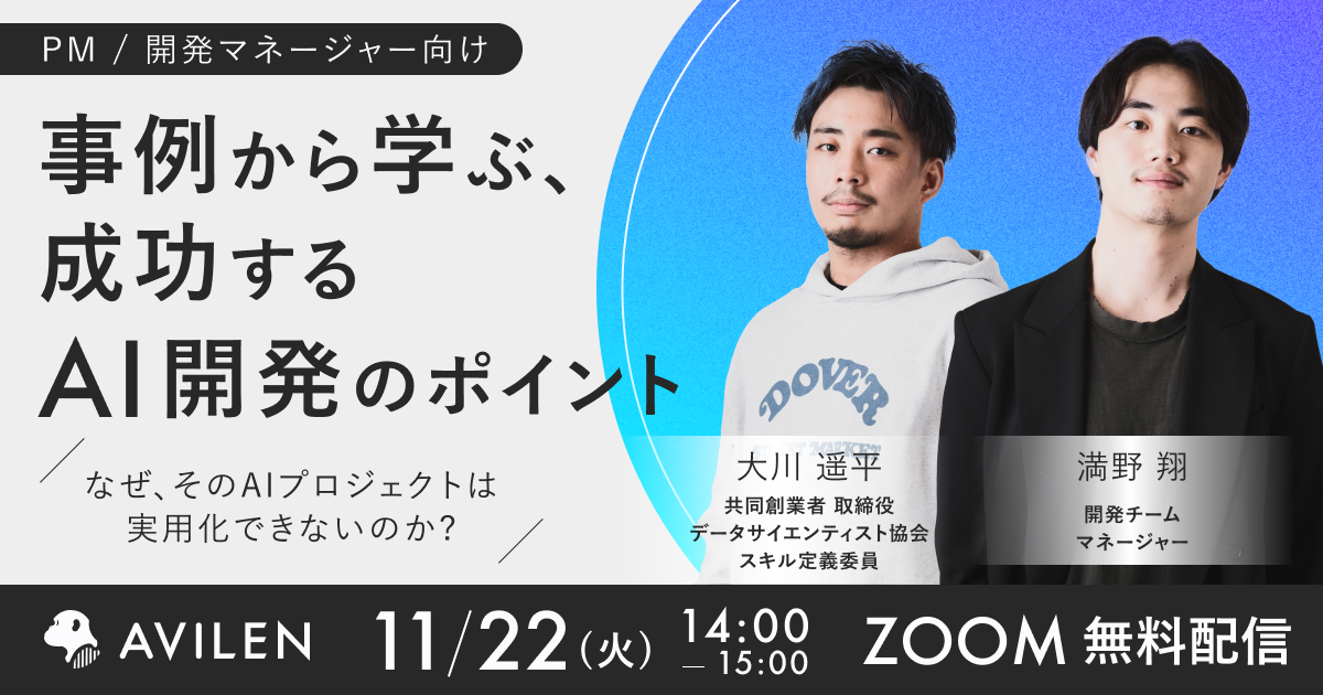 本セミナーでは、AVILENのAIプロジェクトを牽引するデータサイエンティスト2名が、AI開発特有の技術的な観点やプロジェクトマネジメントの観点で、AI開発プロジェクトにおける失敗例と成功に導く手法を最新事例を交えて解説します。