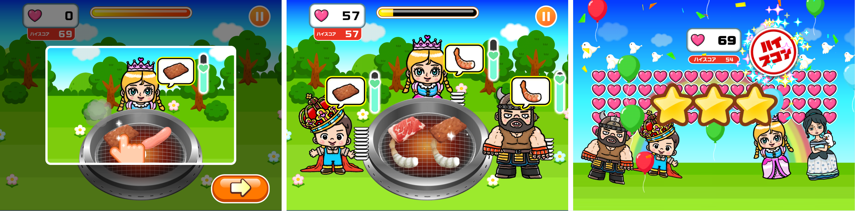 網にのった肉、ソーセージ、えびなどの具材を焼き、食べごろのタイミングでキャラクターに食べてもらうゲームです。制限時間内に食べてもらった数が得点となり、ハイスコアを目指します。