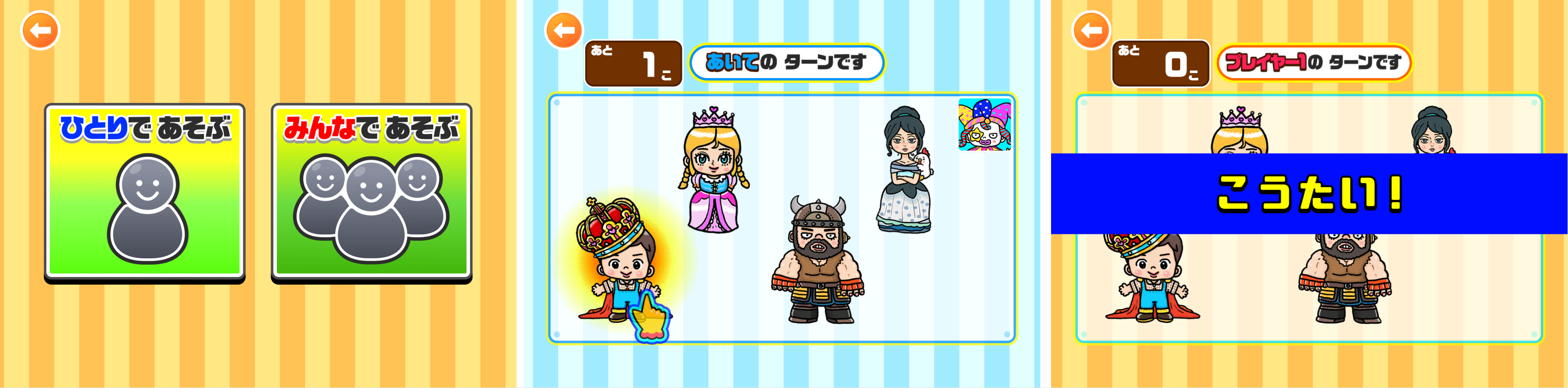 キャラクターやメニューがタップされた順番を記憶し、自分のターンになったら順番通りにタップし、さらに追加で1つ選択してタップしていく記憶ゲームです。順番を間違ってタップした時点で勝敗が決まります。コンピュータ対戦のほか、複数名で対戦することもできます。