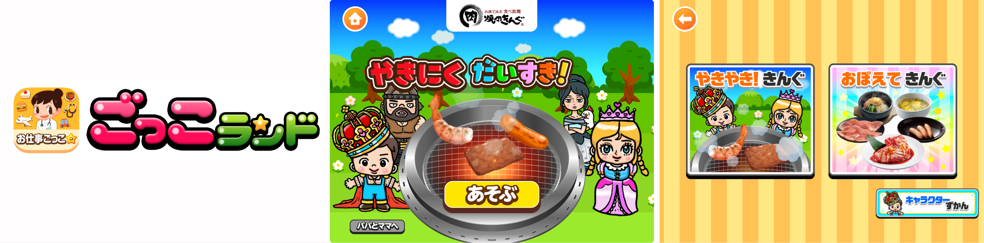 本ゲームを協賛する株式会社物語コーポレーション(以下「物語コーポレーション」)は、焼肉食べ放題専門店です。幼児、小学生の方へのお得な割引サービスもあり、ファミリーを中心に幅広い層のお客さまに選ばれています。子どもたちに本ゲームを通して、「焼肉」や「焼肉きんぐ」をより身近に感じていただきたいという想いから、『ごっこランド』への出店が実現しました。