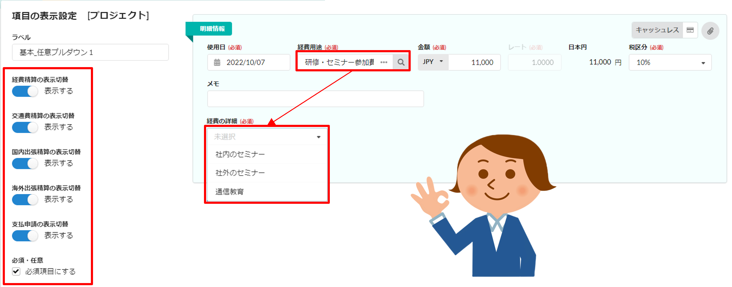 自社の経費処理で必要となる入力項目を追加することができます。また、項目名の表示変更、項目の任意・必須の切り替え、プルダウンリストは他の項目と関連づけて、選択した内容により、次に選択する項目を絞り込み表示することが可能で、経理担当者が管理画面から簡単に設定できます。本機能により、自社特有の事情に合わせた申請画面を設定することで、備考欄を使った個別運用などの手間がかかる作業がなくなり、経費申請ミスを減らすことができます。