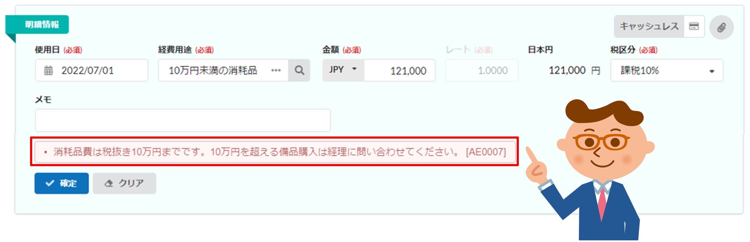 自社の規定に合わせ予めチェック内容を設定することで、経費申請における入力漏れ・入力ミス・ファイルの添付漏れや上限を超えた金額に対して、システムが自動でチェックして警告(エラー・アラート)を表示いたします。例えば、精算金額など主要な項目に警告条件を設定することが可能で、経理担当者が管理画面から簡単に設定できます。