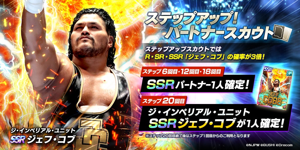 さらに本スカウトでは初参戦★3選手「[ジ・インペリアル・ユニット]ジェフ・コブ」がステップアップ回数に関わらず、獲得確率が通常の3倍かつ獲得時のピース量が増量となったスカウトとなっております。
