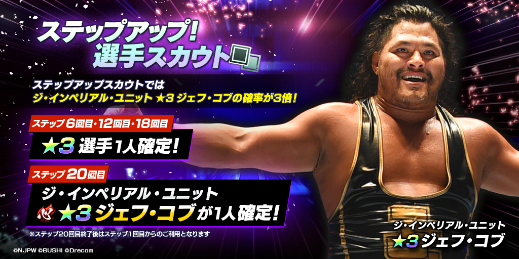 さらに本スカウトでは初参戦★3選手「[ジ・インペリアル・ユニット]ジェフ・コブ」がステップアップ回数に関わらず、獲得確率が通常の3倍かつ獲得時のピース量が増量となったスカウトとなっております。