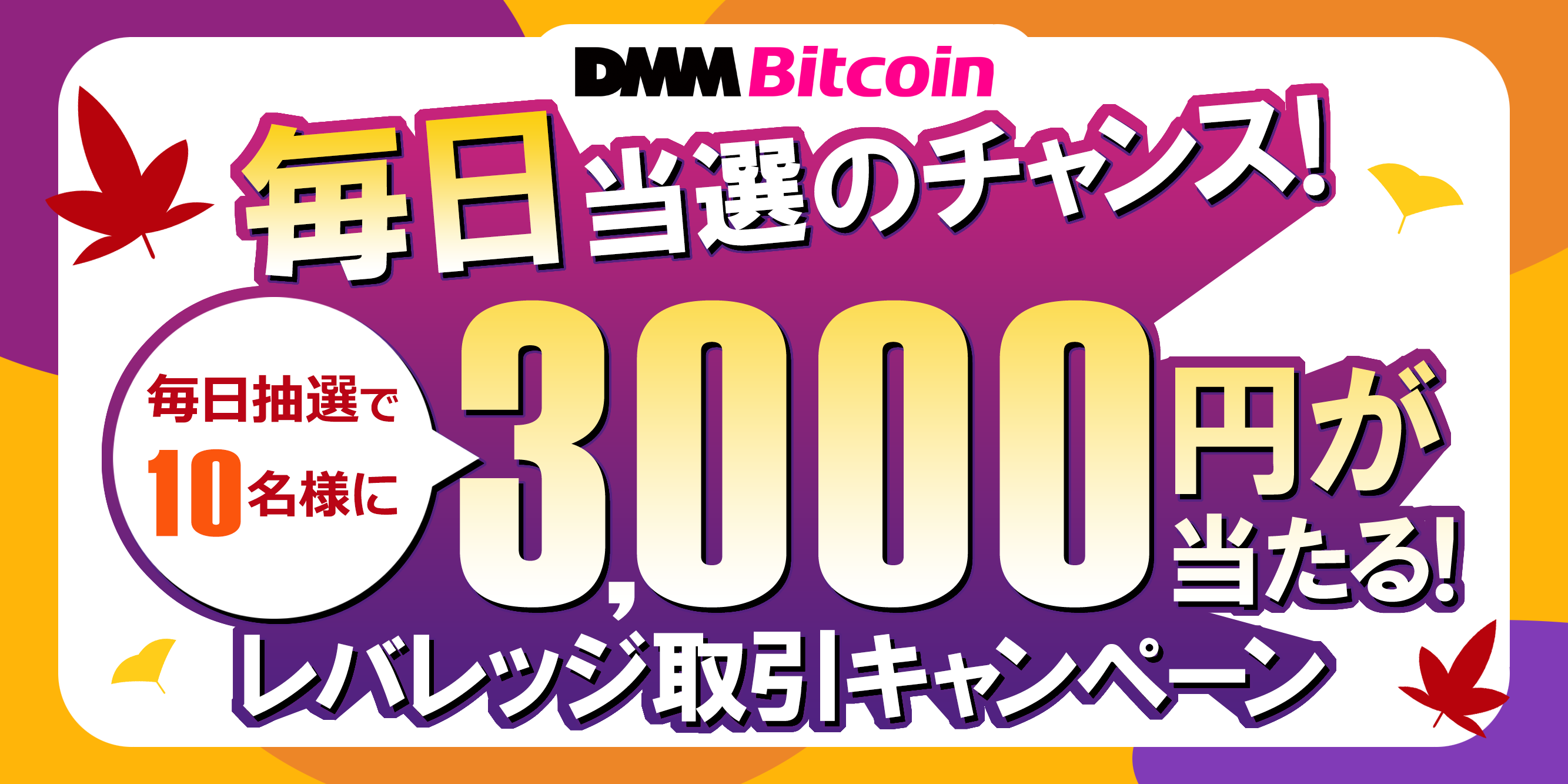 キャンペーン開催日に、レバレッジ取引にて合計30,000円以上の暗号資産の新規注文をされたお客様の中から毎日抽選で10名様(期間中合計100名様)に3,000円をプレゼントいたします。
