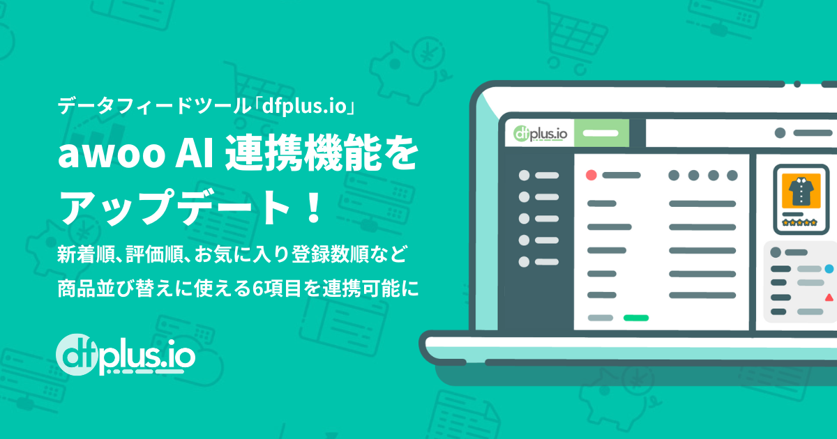 株式会社フィードフォース(所在地:東京都文京区、代表取締役:塚田 耕司)が提供するマーケターのためのデータフィード管理ツール「dfplus.io」は、awoo Japan 株式会社(所在地:東京都渋谷区、代表:林 思吾)が提供するAIサジェストプラットフォーム「awoo AI」用データフィードの管理機能をアップデートいたしました。