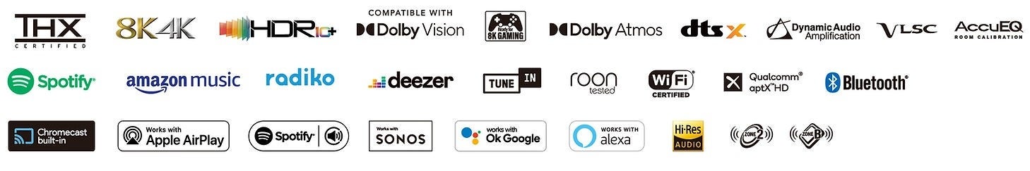 HDMI®の最新規格2.1に対応。最新映像フォーマットに対応することで映画・ゲームコンテンツを最高画質で楽しめます。本機ではHDMI入力3端子がHDMI2.1、8k/60Hz、ダイナミックHDRフォーマットのDolby VisionとHDR10+に対応、その他3端子はHDMI2.0対応となります。