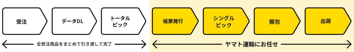 受注から出荷までの作業工程のうち、うしろ半分の作業工程(帳票発行、シングルピック、梱包、出荷)を代行する「梱包・出荷代行」サービスです。通販事業者はその日の出荷分の商品をまとめてヤマト運輸に引渡すだけで作業が完了します。