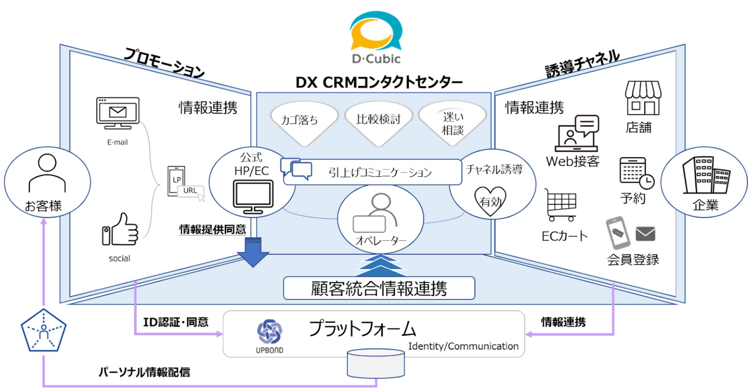 『Dコミ』は、今まで分断されていた顧客ID、顧客情報を統合し、プロモーション情報を問合せチャネルであるコンタクトセンターに連携することで、お客様に最適なコミュニケーションを提供するサービスモデルとなります。