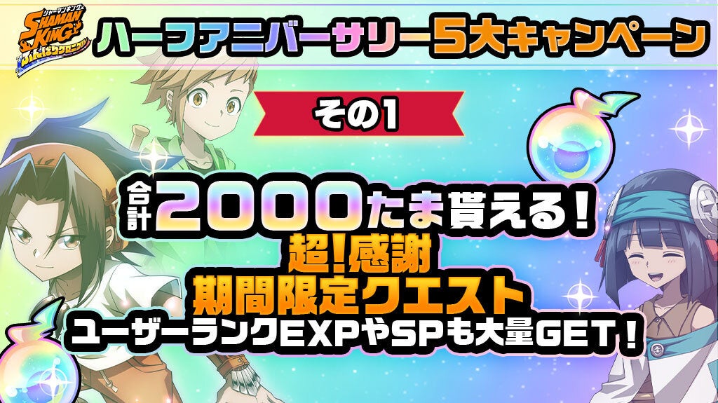 ハーフアニバーサリー第二弾を記念して、超!感謝期間限定クエストを開催いたします!合計で2,000たまが無料で貰える他、毎日お得なアイテムがGETできるチャンスです。
