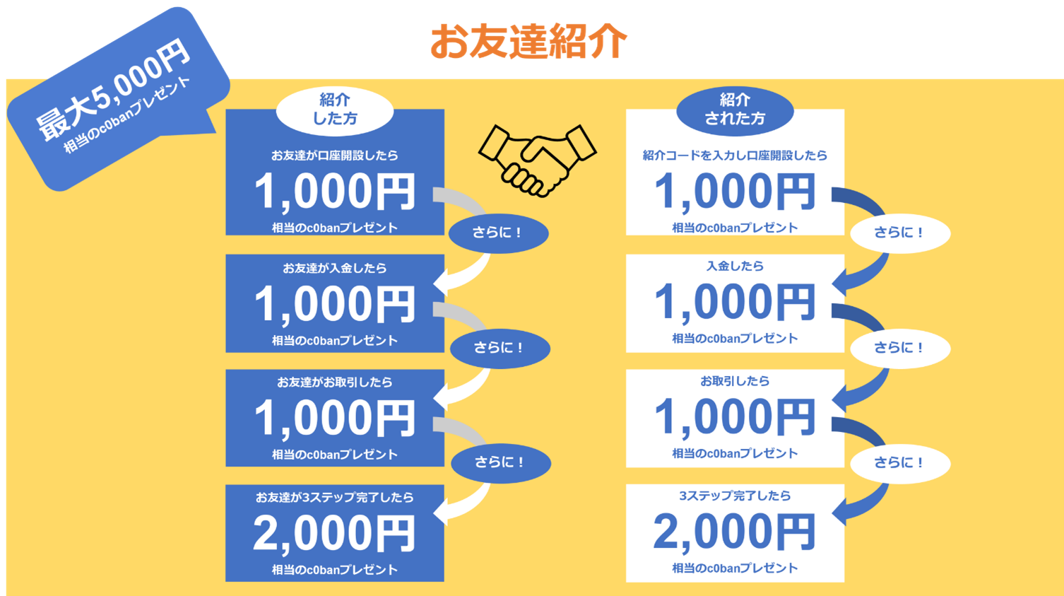 お友達を紹介いただき、紹介された方が新規口座開設(本人確認郵便受け取り)が完了されますと1人につき1,000円相当のc0banをプレゼントいたします。